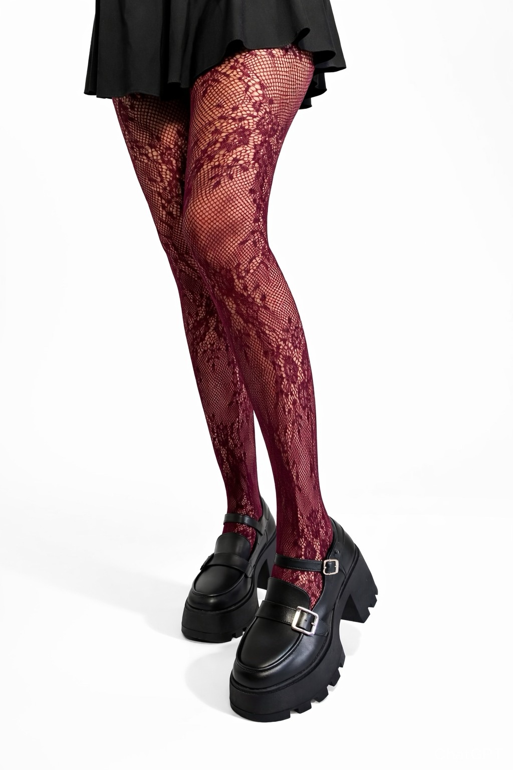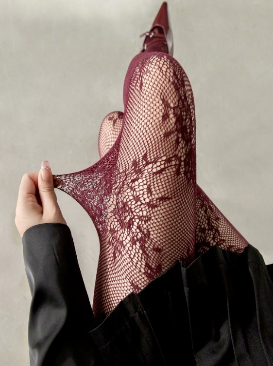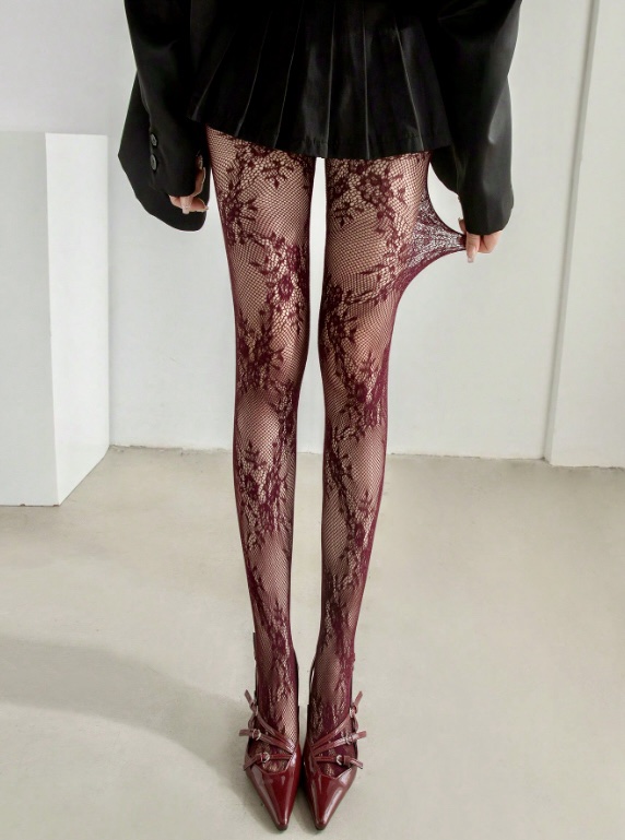 Medias de encaje florar en tono vino que estilizan y elevan cualquier look. Su tejido elástico de alta adaptabilidad ofrece un ajuste cómodo y favorecedor.
