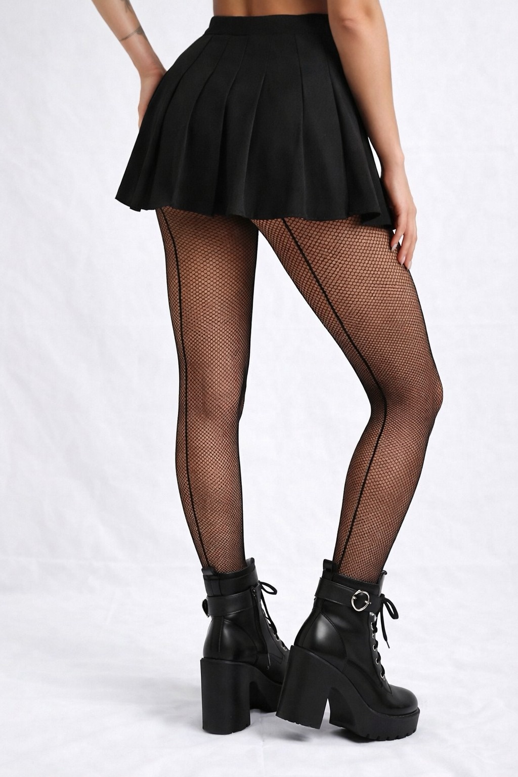Medias de red clásicas con costura trasera que estiliza y alarga visualmente la pierna.