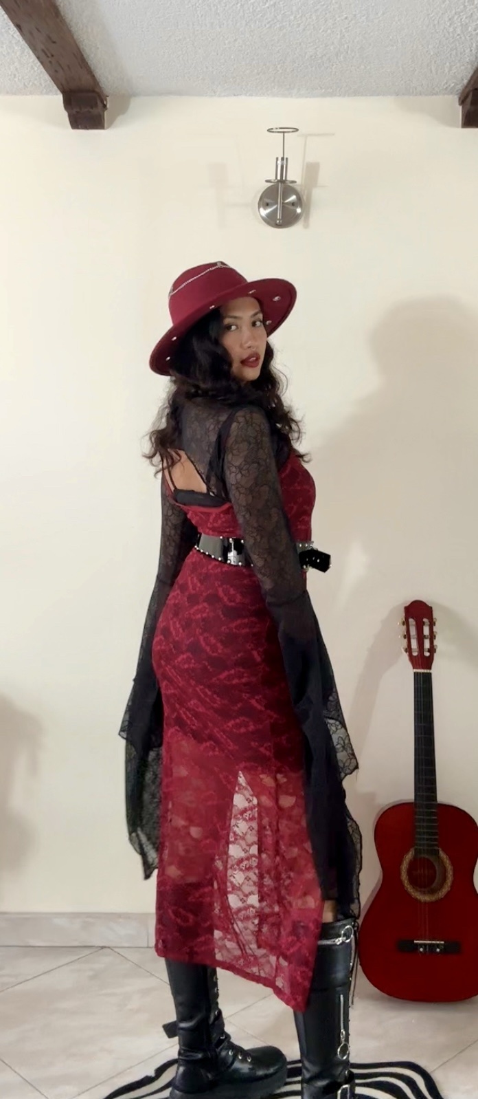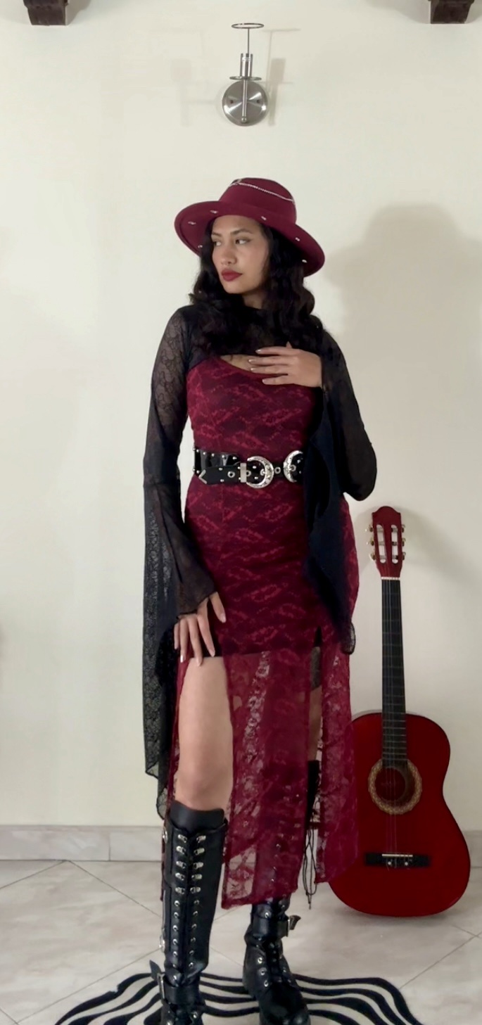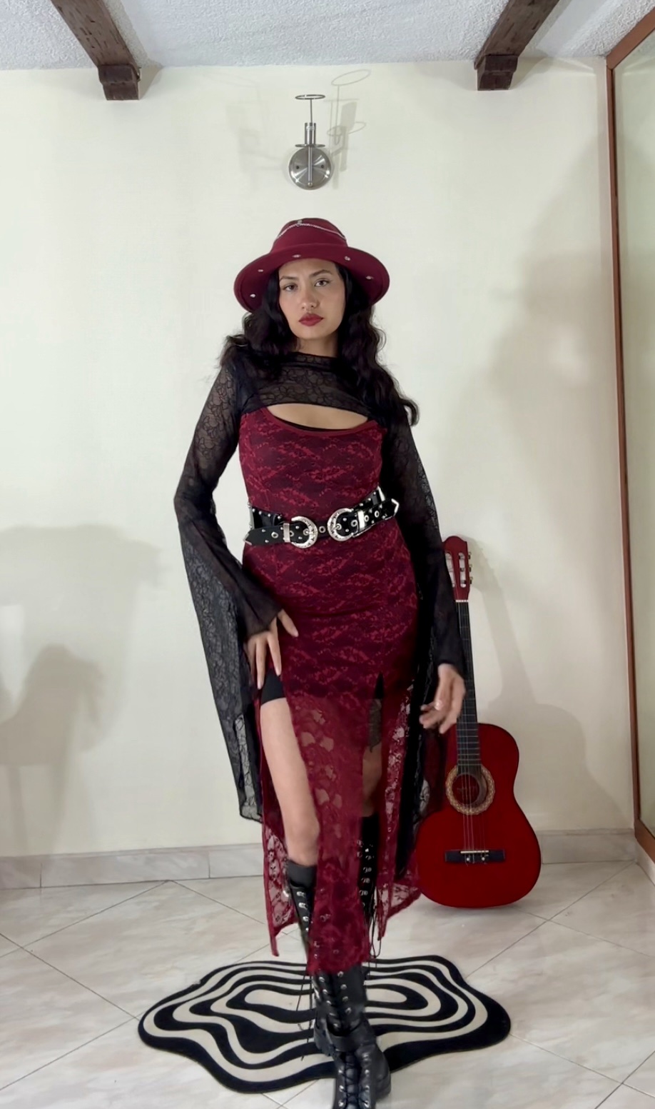 Está confeccionado en blonda vinotinto con un básico negro incluido para usar por debajo, garantizando comodidad y seguridad sin perder transparencia ni misterio.