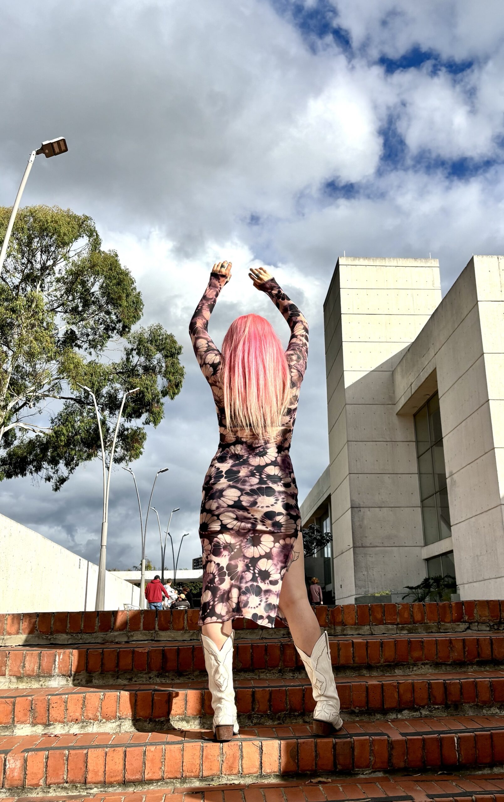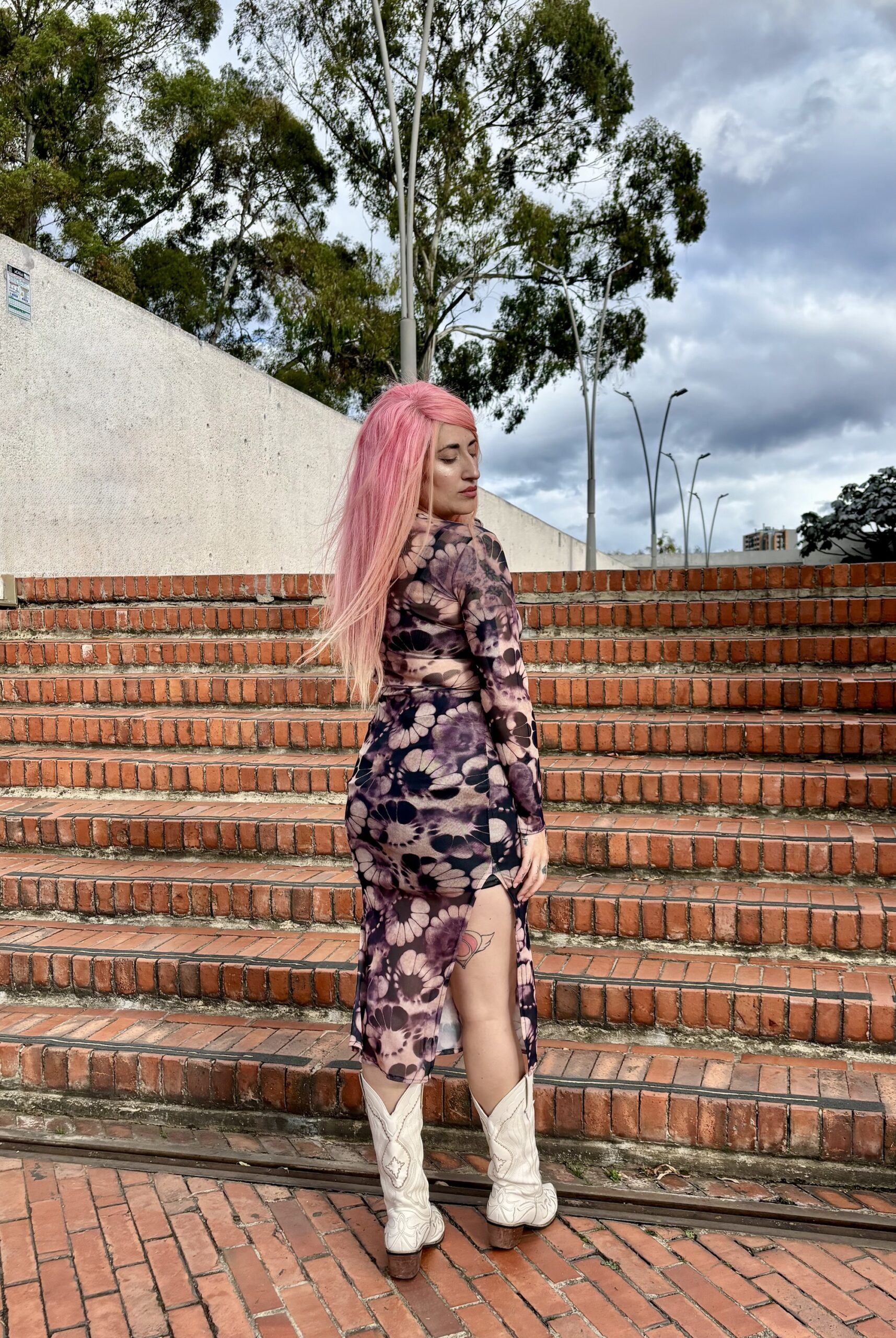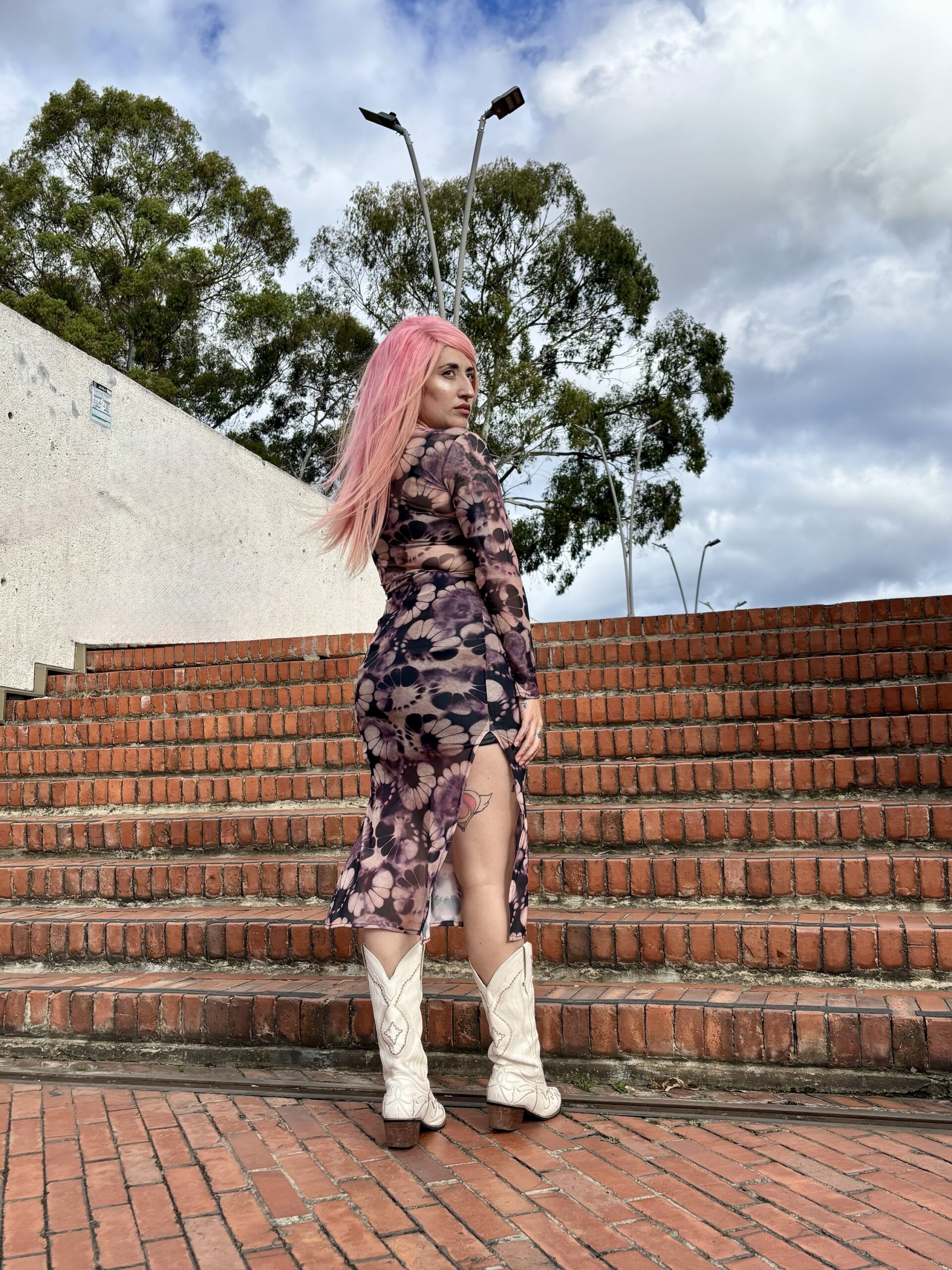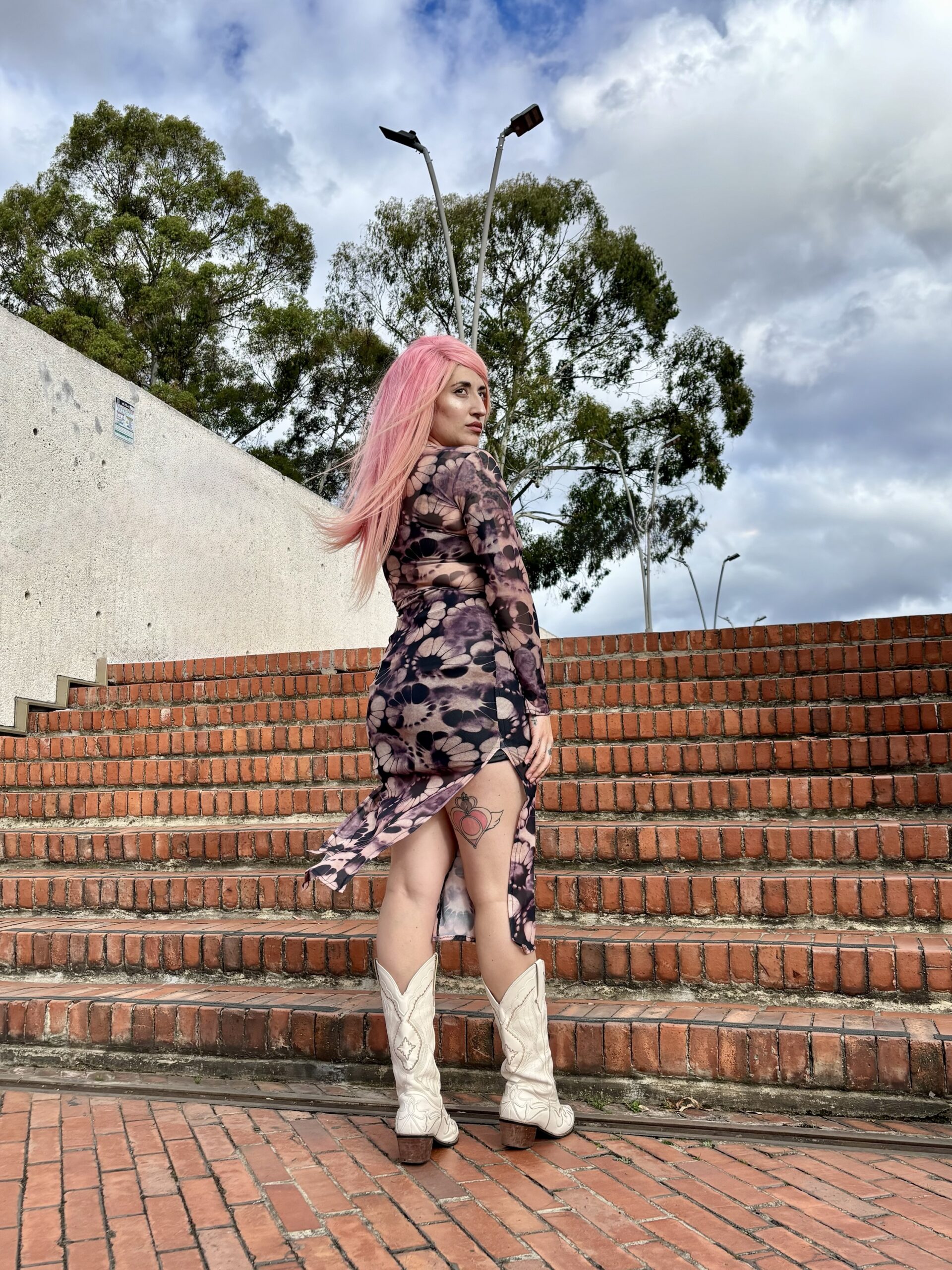 Este vestido nace de la fusión entre lo cósmico y lo terrenal. Diseñado en malla ligera, con detalles que evocan energía magnética del universo, este vestido es una pieza pensada para mujeres que buscan vestir de arte y actitud.